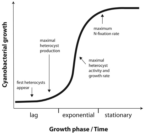 Timeline of growth and N fixation events for the cyanobacterium N. punctiforme grown under axenic conditions. During the lag phase of growth, the cyanobacteria produces heterocyst cells alongside vegetative cell growth; heterocyst cell production occurs within 1–3 days. The maximum rate of heterocyst production occurs while the cyanobacteria is still in lag phase, but just before exponential growth, which is characterized by the highest growth rate and maximal per cell heterocyst N fixation activity. Once the cyanobacteria reach the stationary phase, overall N fixation is highest due to the greatest amounts of total heterocyst cells.