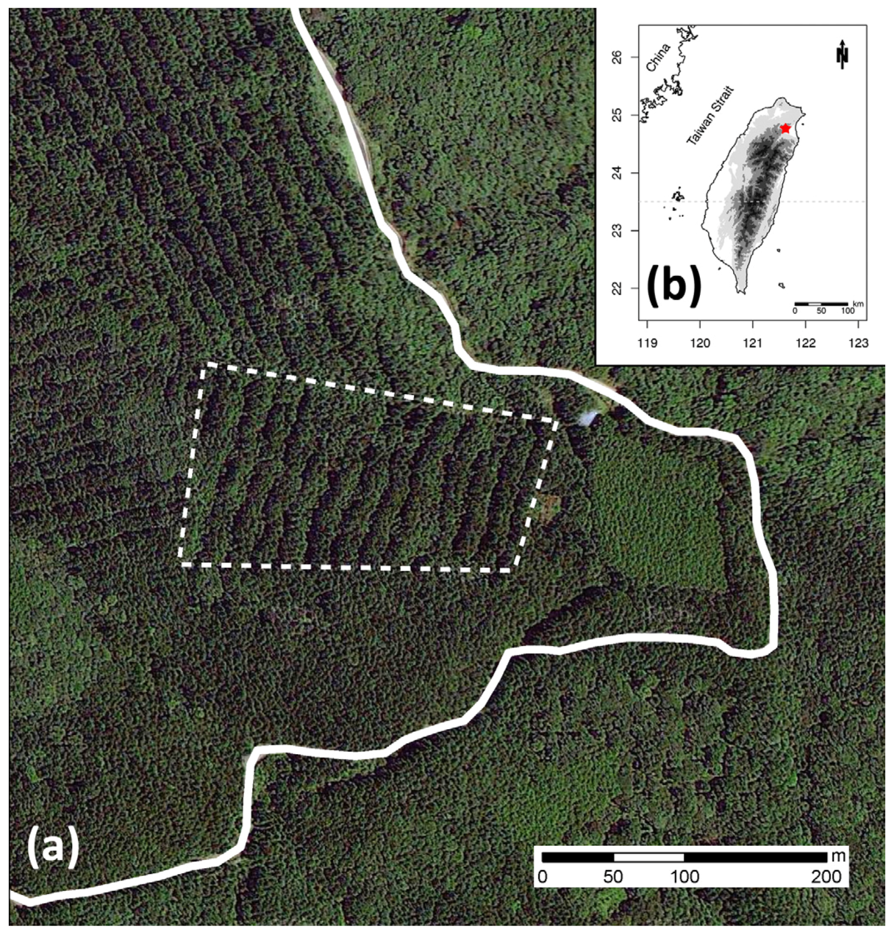 The 2-ha experimental plantation site (encompassed by a white-dashed polygon) near an unpaved road (solid white line) (a) on Chilan Mountain in northern Taiwan (b).