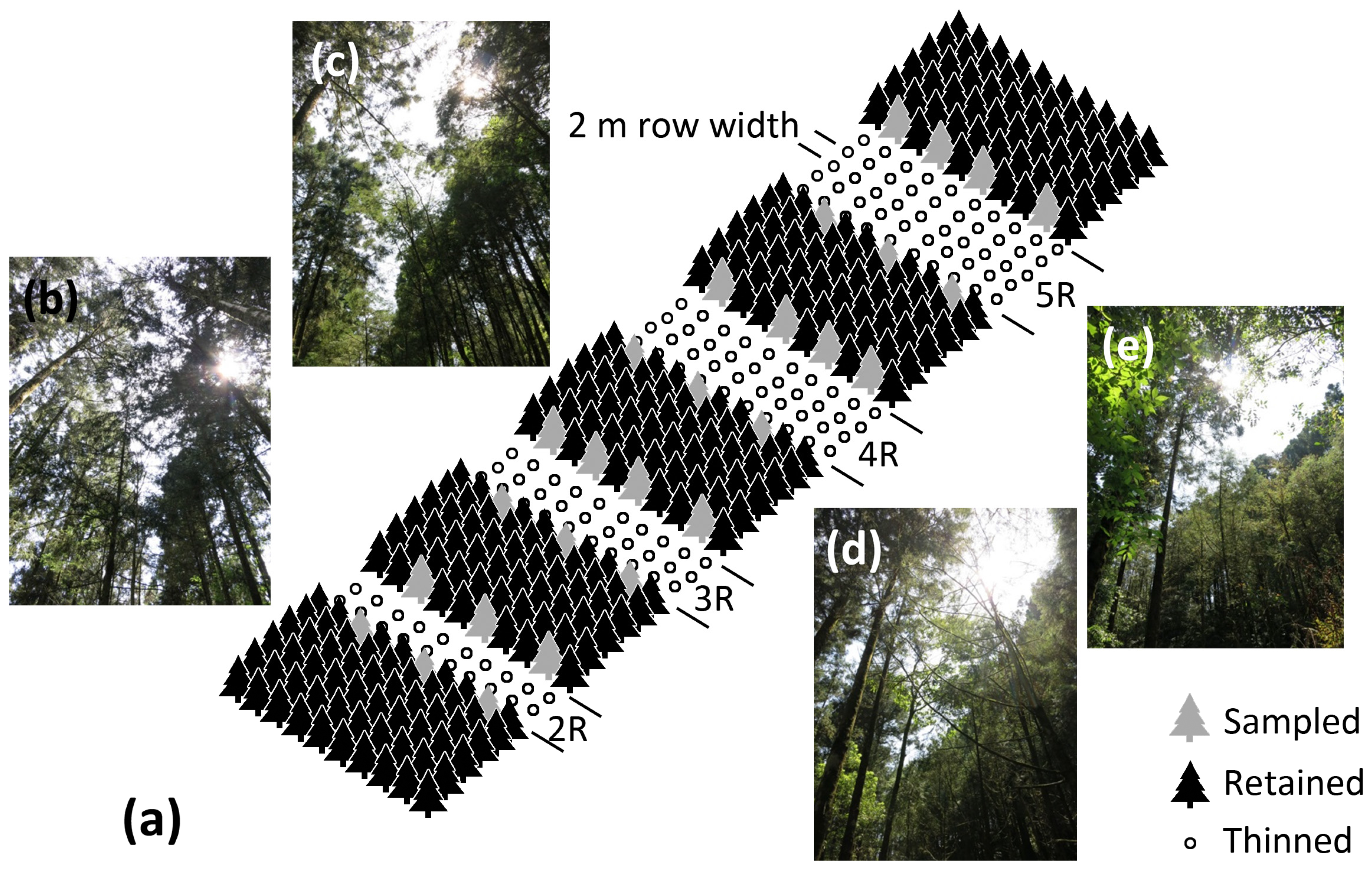 (a) Thinning treatment schematic depicting 2–5 row (R) cuttings with 2-m row widths. Six rows of trees were retained on either side of the cut strips (b–e). The selection of sample was based on the size distribution of diameter at breast height (DBH) for each group. Photographs show current conditions of row thinning from 2 to 5R, respectively, taken by C. Chung on 16 April 2015.