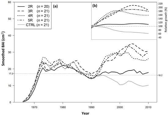 - Fraver, S.; White, A.S. Identifying growth releases in dendrochronological studies of forest disturbance. Can. J. For. Res. 2005, 35, 1648–1656. [Google Scholar] [CrossRef]
