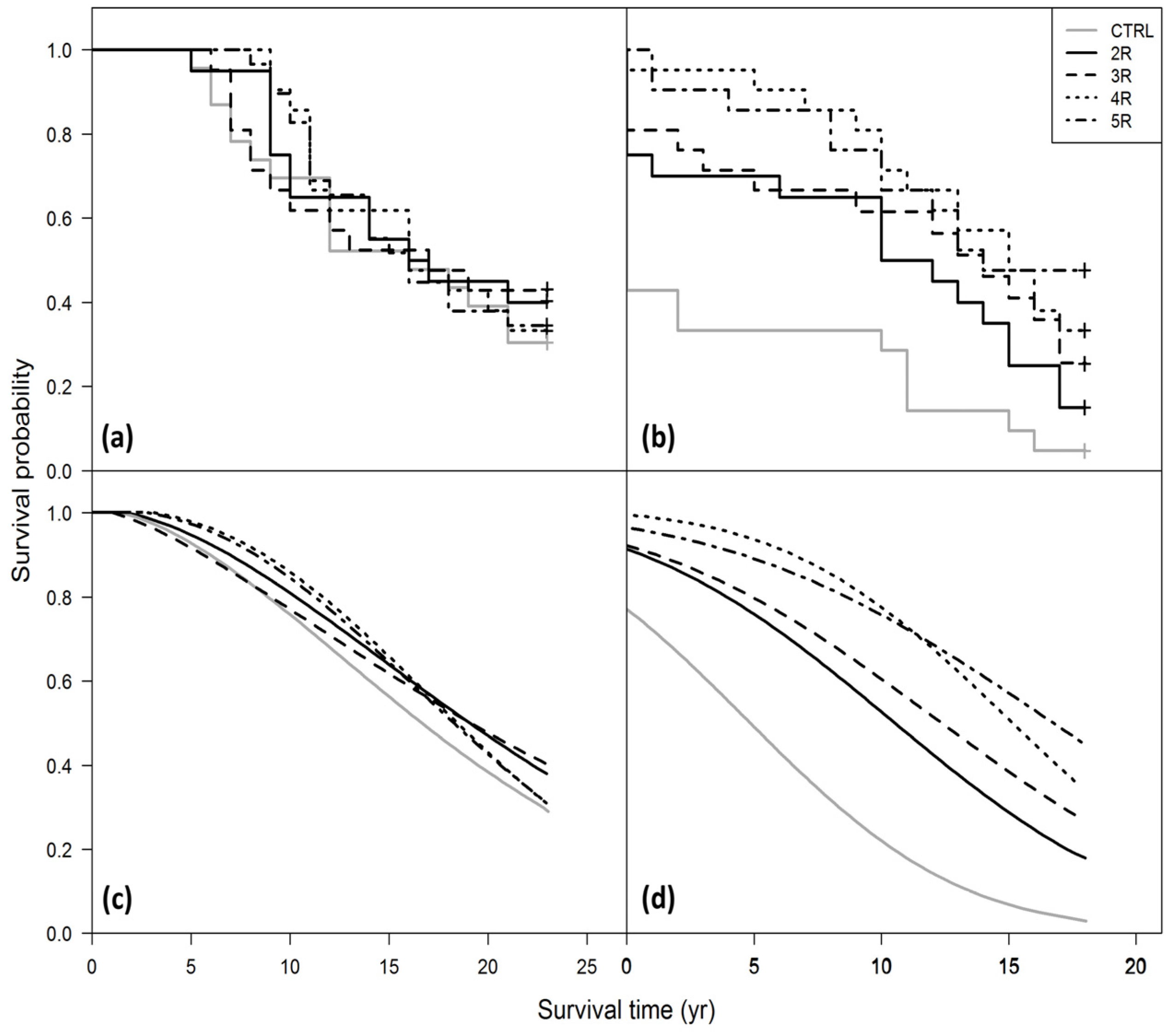 Estimated survival curves for control and thinning treatments using the Kaplan-Meyer method and an accelerated failure time regression model for pre-thinning (1966–1990) (a and c) and post-thinning (1991–2011) periods (b and d), respectively.