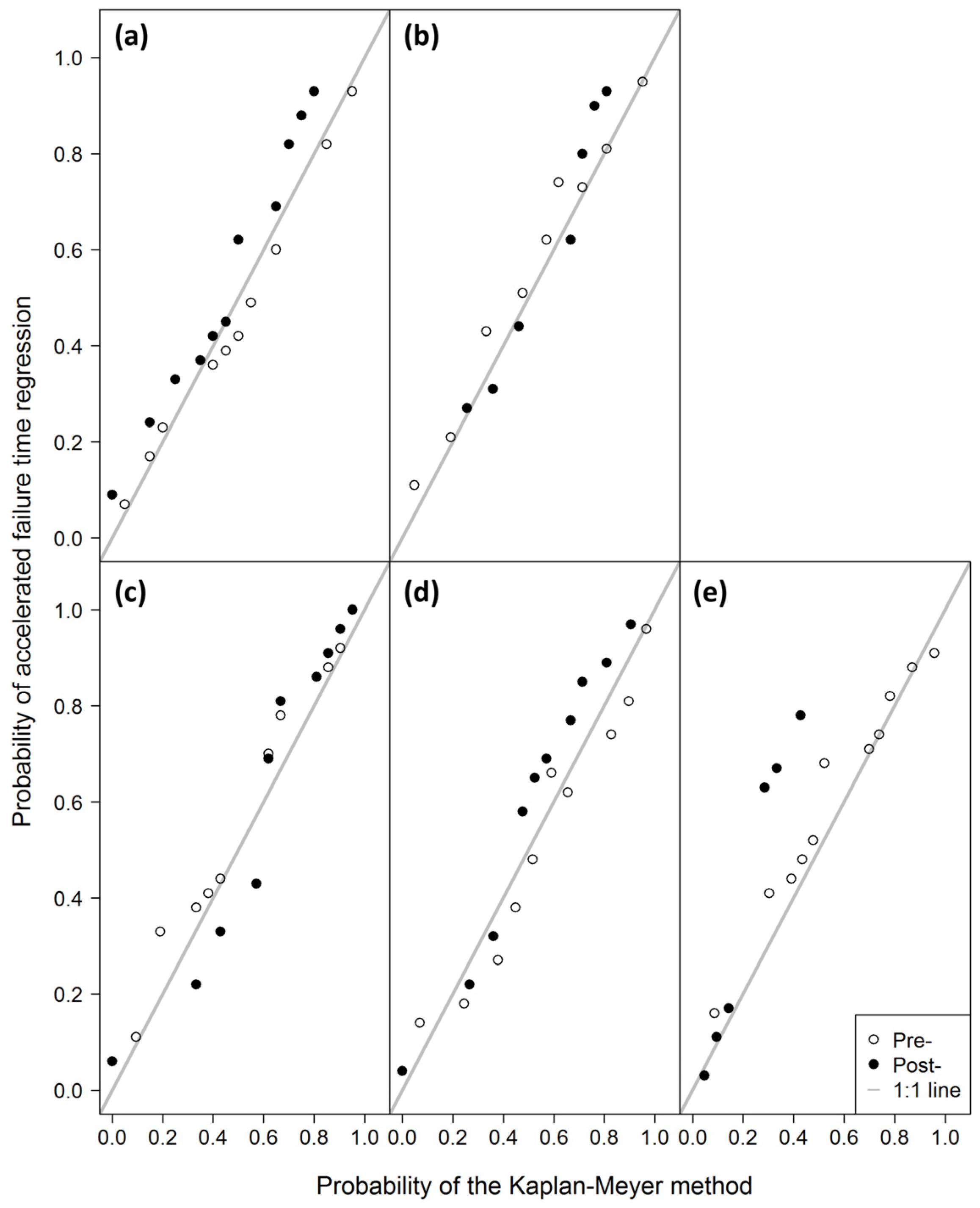 Accelerated failure time regression model probability estimation for pre- and post-thinning conditions based on the Kaplan-Meyer method for different treatments: (a) 2R, (b) 3R, (c) 4R, (d) 5R, and (e) CTRL. The gray lines indicate the 1:1 relationship.
