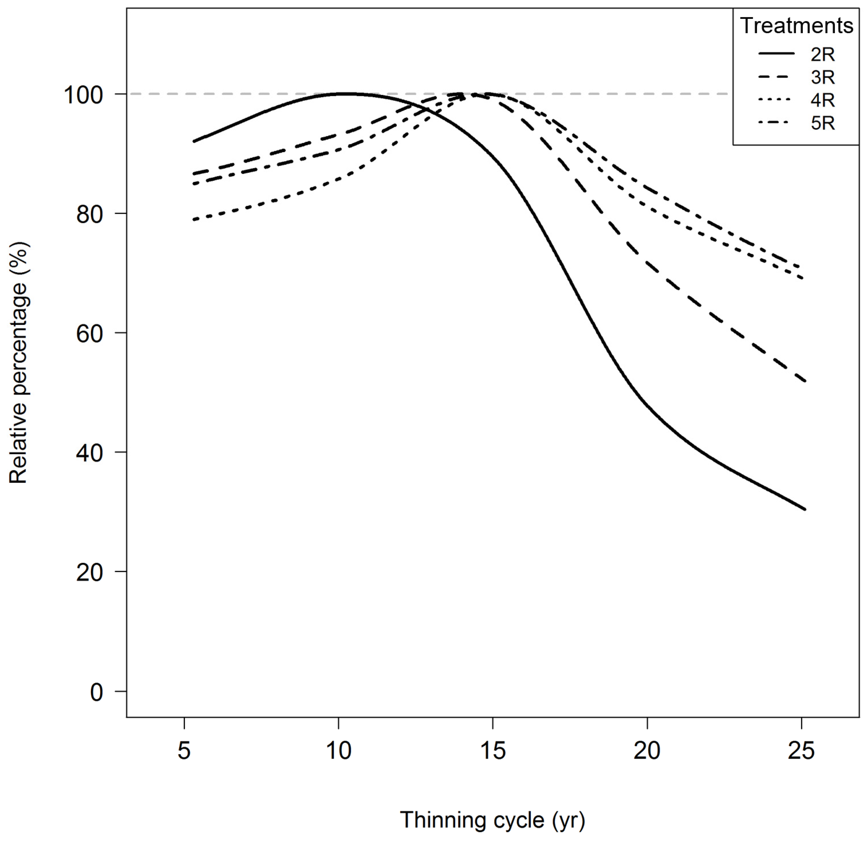 Model validation was conducted to assess the performance of event history analysis. The polynomials were derived to fit the observed growth trends (1991–2011) of different treatments (2–5R), which were used to simulate tree-ring increments for the study period. Wide but reasonable ranges for repeat thinning (5–25 years) [39] and observation (100 years from the initiation of thinning in 1990) periods were set for the comparisons (%), which were the relative percentages defined as ratios of mean annual growth gains (cm·tree–1·year–1) of different repeat thinning periods and treatment, and the corresponding event history analysis-derived time validities with the multiplication of 100. If the modeled time of thinning was ideal, the ratios should not be greater than 100%.