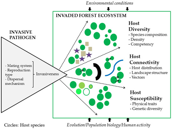 Local, regional, and continental-scale factors governing the spread and impact of invasive forest pathogens post-introduction and establishment are affected by three main factors: host diversity, host connectivity, and host susceptibility. Following arrival and establishment, invasiveness is inherently affected by organismal traits (mating system, reproduction type, and dispersal mechanisms). Host diversity is mainly affected by plant species richness (density/composition) creating a dilution effect of pathogen impacts on the ecosystem. Non-hosts, competent hosts, and less competent hosts will have variable effects on their ability to intercept inoculum and subsequently reduce pathogen spread. Host connectivity is largely influenced by the distribution of available host species; more or less aggregated. Spatial heterogeneity of hosts becomes important for vector-induced pathogens. Variations in landscape structure (topography, natural geographic/environmental barriers, forest fragmentation) will largely influence spread dynamics on the landscape level. Host susceptibility to invasive pathogens is influenced by physical traits (size, age, morphology), the random presence of other (potentially antagonistic) organisms, environmental and site factors, and host genetic background. Intraspecific genetic diversity (mixtures of host genotypes) offers the best insurance against invasive pathogens through a dilution effect on inoculum production/deposition and the likelihood that some hosts will possess effective mechanisms to resist or minimize damage caused by invasives. Evolutionary and environmental factors, as well as continuous pressures caused by human activity will influence spread dynamics over time. Understanding how host variability is affected by host diversity, connectivity, and susceptibility will improve our ability to predict disease spread on the landscape and potential consequences to ecosystem services.
