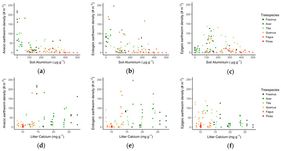 Relation between exchangeable Al concentration in the 0–5 cm soil layer (a–c) or Ca concentration in foliar litter (d–f), and density of anecic (a,d), endogeic (b,e), and epigeic (c,f) earthworms. Plots where zero earthworms were found are indicated by a cross symbol. The foliar litter Ca concentration was previously published by Vesterdal et al. [36].