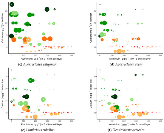 The density of the most common earthworm species (anecic: L. terrestris (a) and A. longa (b); endogeic: A. caliginosa (c); A. rosea (d); and epigeic: L. rubellus (e) and D. octaedra (f)) in relation with exchangeable soil Al concentration and Ca concentration in litter. Earthworm density is shown by the size of the circles; a cross symbol indicates plots where no earthworms were found. The color of the circle indicates the tree species. The foliar litter Ca concentration was previously published by Vesterdal et al. [36].