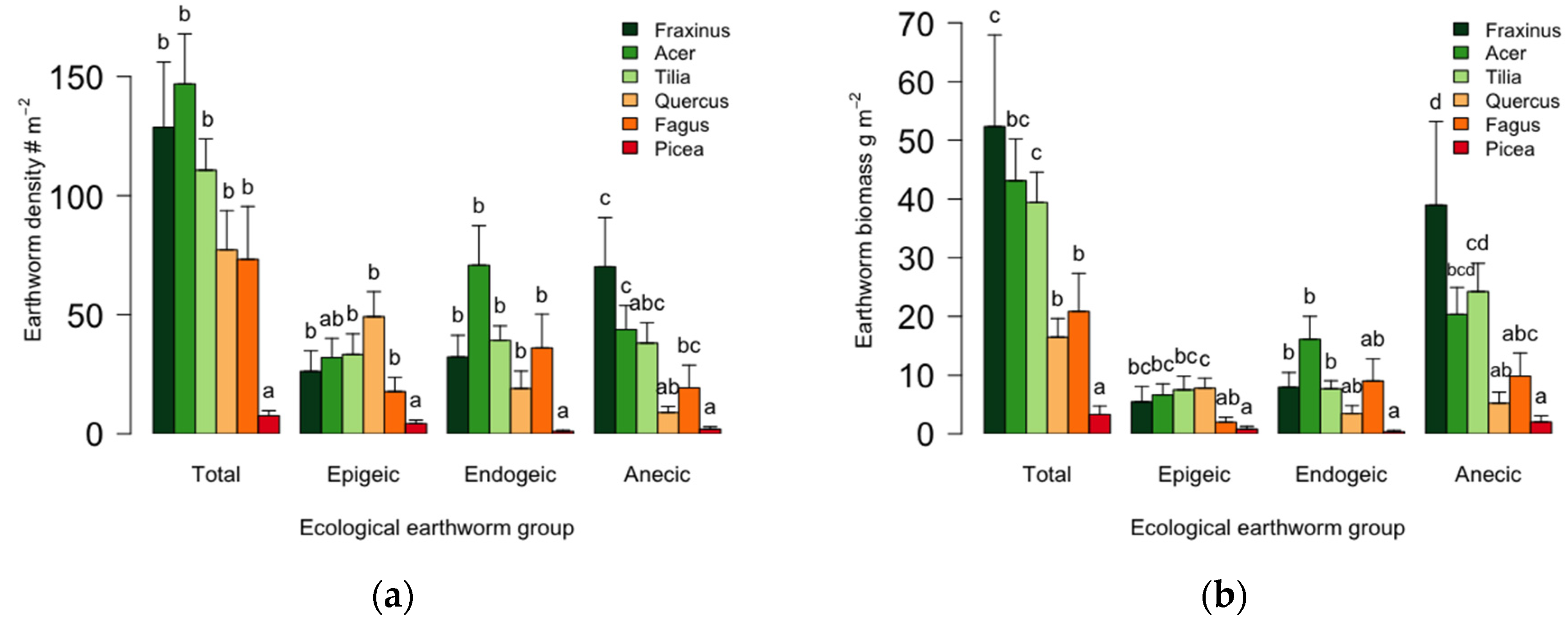 Total earthworm density in the studied plots ranged from zero to 428 individuals m−2 and total earthworm biomass amounted to maximally 202 g·m−2. Figure 2 shows the tree species-specific responses in earthworm communities. In Picea stands, earthworm populations were absent from half of the plots, and across all sites, significantly, they contained the lowest total earthworm densities and biomasses of all tree species. Quercus and Fagus stands contained, on average, an intermediate total earthworm density and biomass. The highest earthworm densities and biomasses were found in Fraxinus and Acer stands and Fraxinus and Tilia stands, respectively.