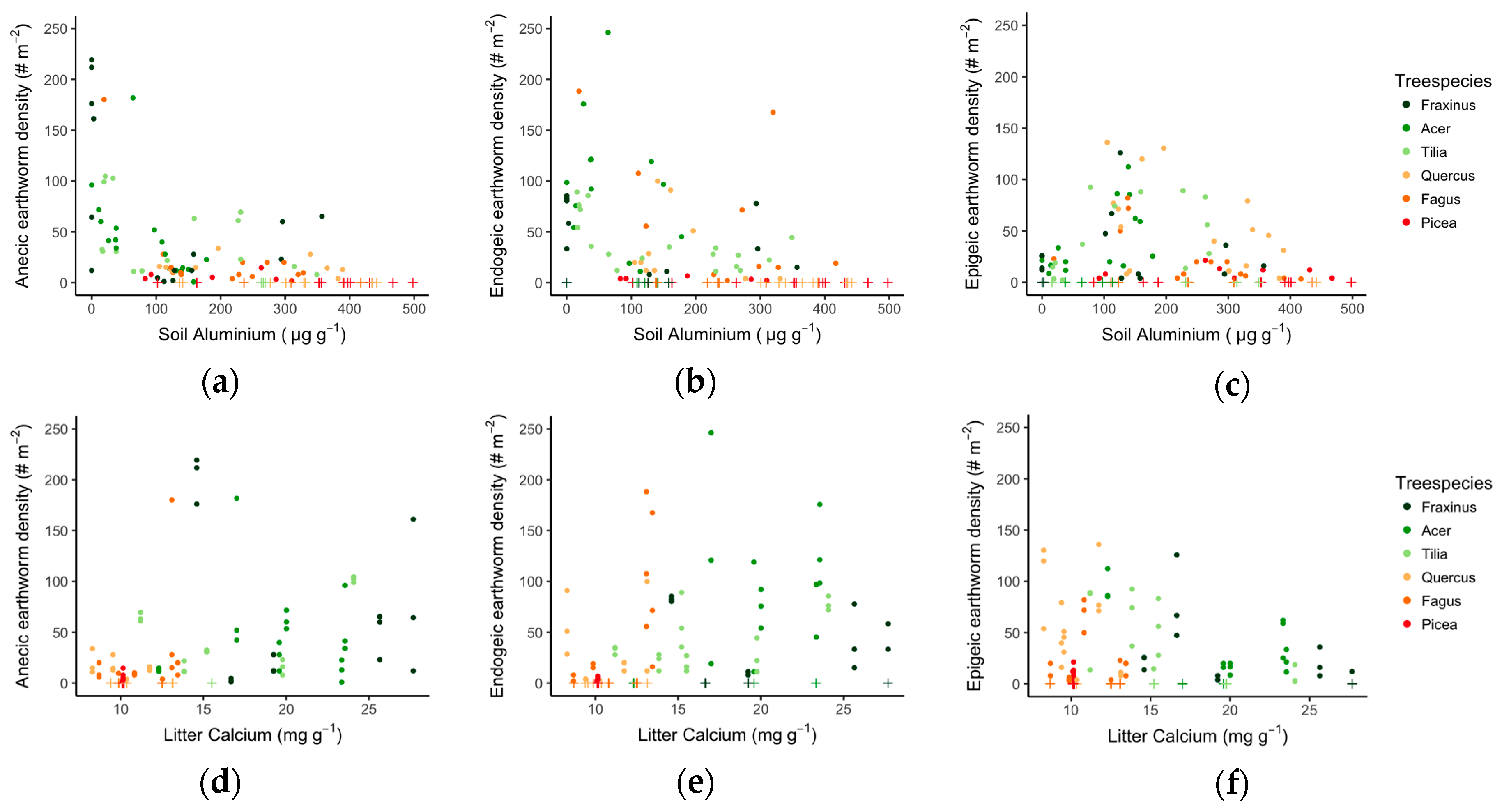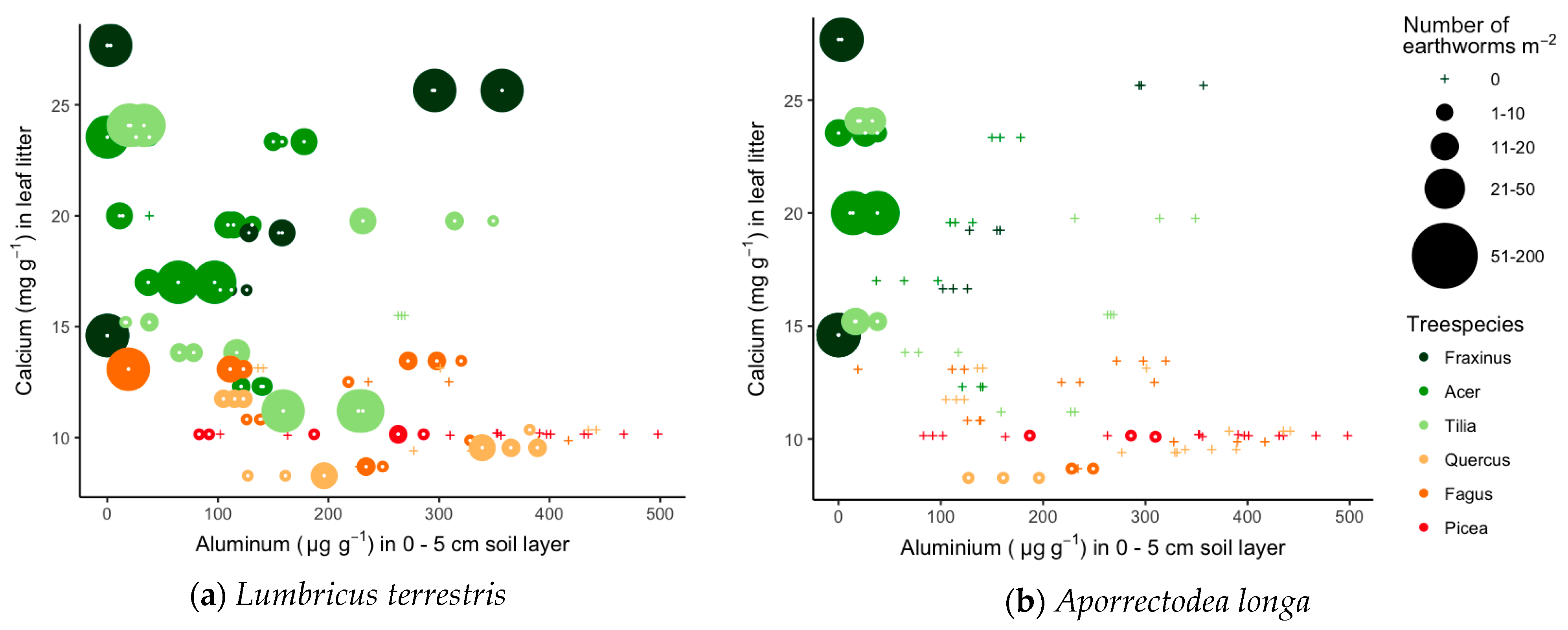 In forests, the environmental factors that regulate earthworm communities include litter traits and soil characteristics, mainly clay content, pH, base saturation, soil moisture content, organic matter content and aluminium (Al) toxicity [2,23]. Soil pH correlates strongly positively with soil calcium (Ca) and negatively with soil Al concentration, and is among the most important drivers for anecic and endogeic earthworms, i.e., the burrowing earthworm community. A study in multiple Fagus sylvatica stands on a gradient from acid to limestone soils showed that burrowing earthworm densities were most strongly positively linked with the presence of a limestone layer and almost absent from Ca-poor soils [24].