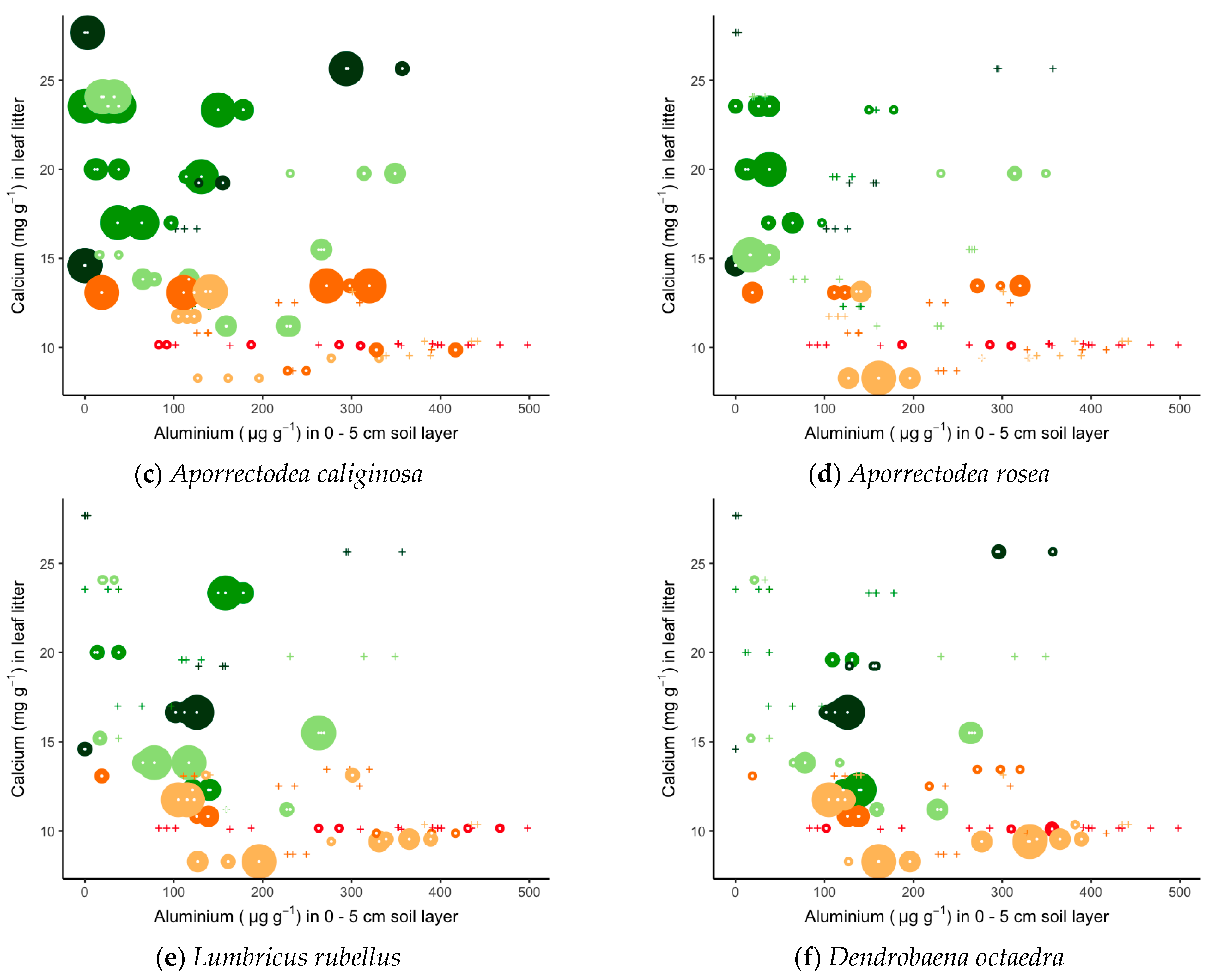 Although the explanatory variables differed between the ecological earthworm groups, exchangeable soil Al and leaf litter Ca concentrations were almost always present in the final models for burrowing earthworms (i.e., anecic and endogeic species). Since pH-KCl seems to be better known as a soil variable than exchangeable Al concentrations, we provide more insight into exchangeable Al in Figure 4a. Exchangeable Al concentrations are strongly inversely related with pH-KCl.