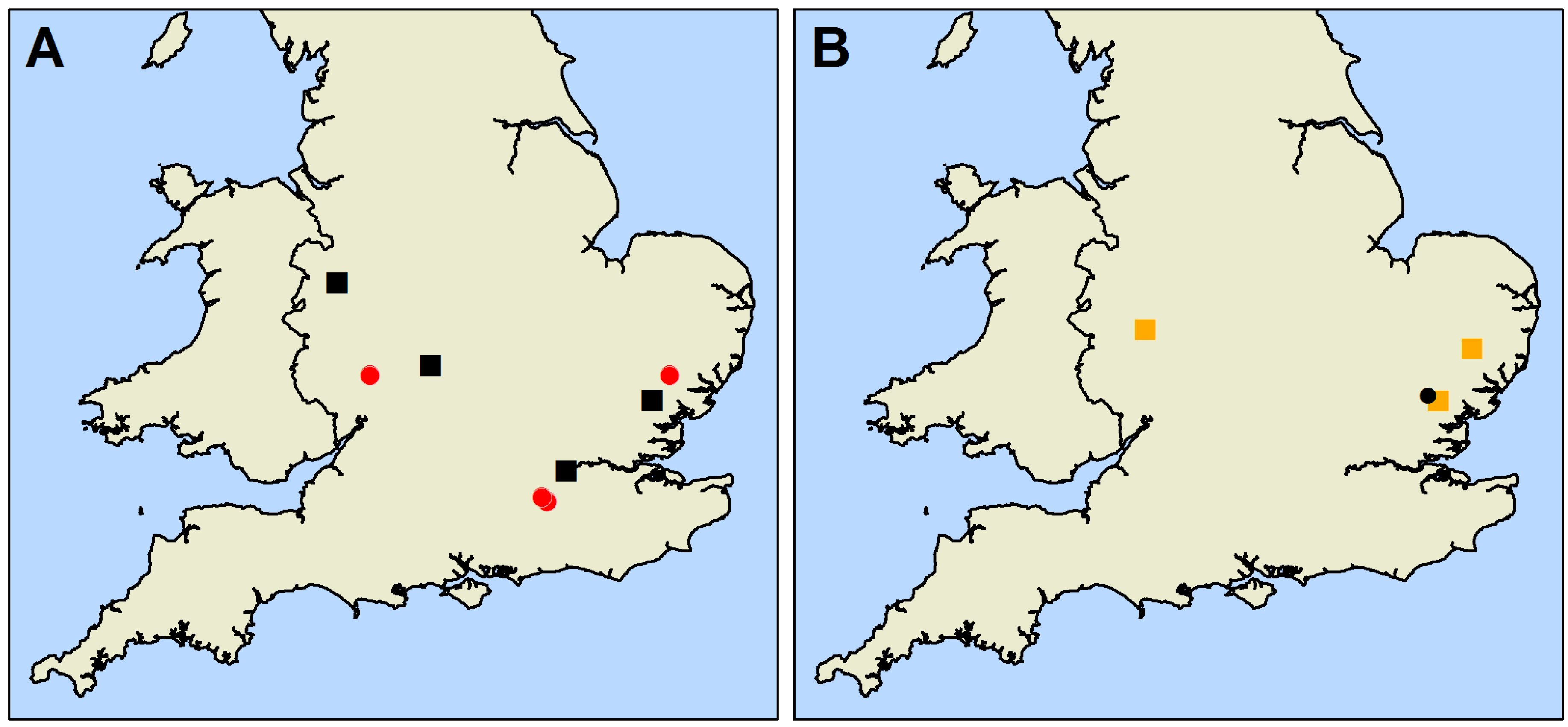 Locations of the sites used in this study. (A) shows the locations of the eight monitoring sites, 2009 sites are red circles and 2010 sites are black squares. (B) shows the locations of the trapping experiments. The 2010 colour trial is shown as a black circle and the 2011 experimental sites are shown as orange squares. For the latter both the most westerly and most easterly squares represent two blocks with the remaining square indicating the location of a single block.