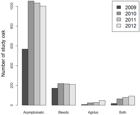 Co-occurrence of emergence holes and stem bleeds. For each year of monitoring total counts of all live oak are presented in four categories: asymptomatic trees (no bleeds and no emergence holes), trees with stem bleeds only, trees with Agrilus emergence holes only and trees with both stem bleeds and emergence holes.