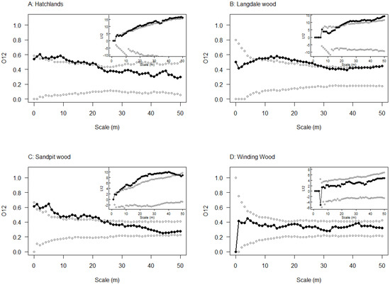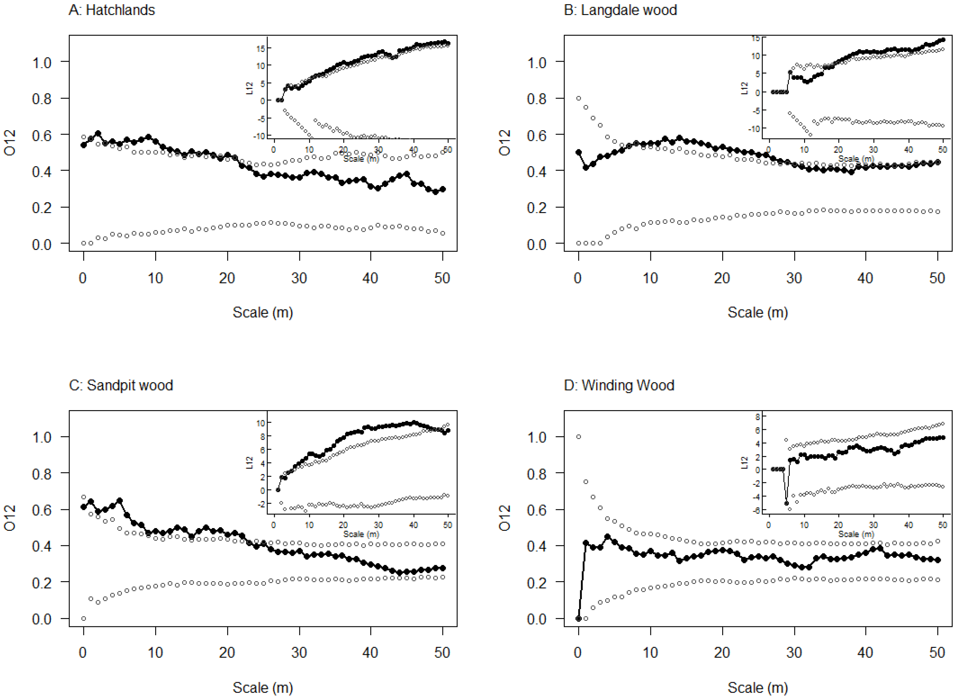 Assessment of clustering of all oak symptomatic for stem bleeds around all oak with emergence holes at the four 2009 study sites: (A) Hatchlands; (B) Langdale wood; (C) Sandpit wood; and (D) Winding wood. For each plot the main axis shows outputs of the O-ring analysis and the inset graphs shows the L-function analysis. Test statistics are shown with black filled circles and lines and simulations envelopes are open grey circles. Significant clustering can be detected when the black line falls above the grey dots generated from simulations.