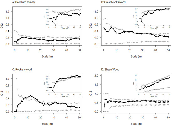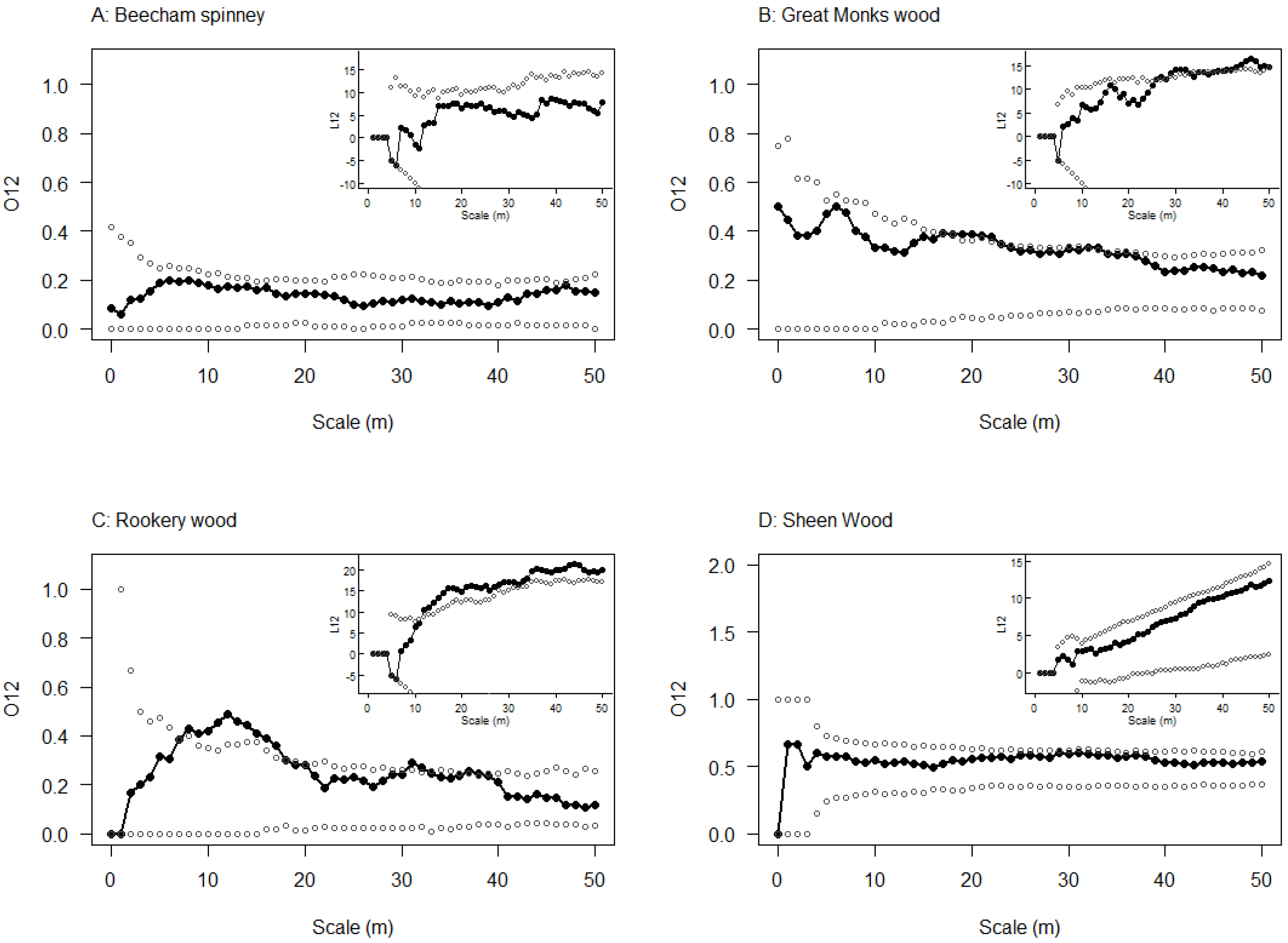Assessment of clustering of all oak symptomatic for stem bleeds around all oak with emergence holes at the four 2010 study sites: (A) Beecham spinney; (B) Great monks wood; (C) Rookery wood; and (D) Sheen wood. For each plot the main axis shows outputs of the O-ring analysis and the inset graph shows L-function analysis. Test statistics are black filled circles and lines and simulations envelopes are open grey circles. Significant clustering can be detected when the black line falls above the grey dots generated from simulations.