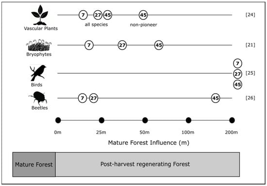 Mature Forest Influence for a suite of mature-forest-associated species in the wet eucalypt forests of Tasmania based on a series of concurrent studies in Southern Forests Tasmania [21,24,25,26]. Mature Forest Influence refers to the predicted distance from an edge into harvested forest (represented by circles) up to which community composition differs from the regeneration forest interior. There were five replicate sites of three age classes of clearcutting; ~7 year old, ~25 year old, and ~45 year old coupes. At each site, three transects of plots extended from 35 m into mature forest, across edges, to 200 m in the centres of regenerating forest in the clearcuts. Bootstrapping was used to predict the distance from edge where community composition was 95% similar to that in the clearcut centres. These distances were thus the predicted extent of mature forest influence. Datasets were: 108 vascular plant species [24], 96 bryophyte species [21], 271 ground-active beetle species [26], and 38 bird species [25].
