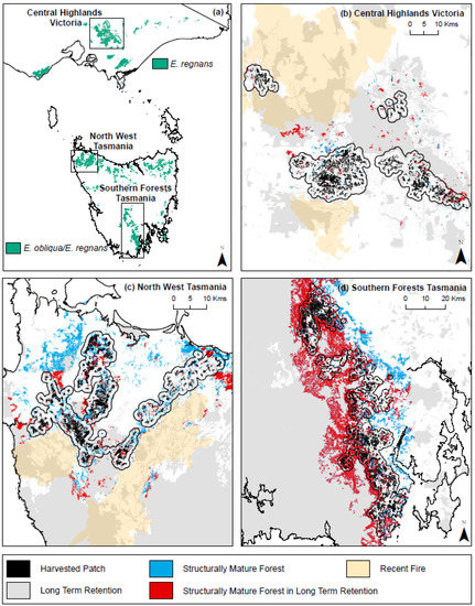 Fire and timber harvesting can diminish the extent of older forests in the near term. The amount and configuration of mature and regenerating forest in the landscape (landscape structure) influences habitat suitability for mature-forest-associated species. We applied spatial analysis to describe the landscape structure of three wet eucalypt forest landscapes in south–eastern Australia and used the results from empirical biodiversity studies to frame interpretation of possible impacts on habitat suitability. We determined the extent of structurally mature forest, its reservation status, and the extent to which it may be edge affected. We also assessed how landscape structure potentially impacts the re-establishment of mature-forest-associated species into previously harvested areas through the proximity to (mature forest influence)—and extent of (landscape context)—mature forest in the surrounding landscape. Our analyses were designed to inform forest management initiatives that draw on these landscape-scale concepts. Central Highlands Victoria had less structurally mature eucalypt forest (4%) compared to North West Tasmania (14%) and Southern Forests Tasmania (21%). Detrimental effects of edge influence on structurally mature forest appeared relatively minor. Low levels of mature forest influence combined with low-medium surrounding mature forest cover (landscape context) indicate potential limitations on recolonisation of coupes by mature-forest-associated species. Our results vindicate the recent shift toward variable retention silviculture and landscape context planning. Our approach to landscape analysis provides a useful framework for other managed forest landscapes.