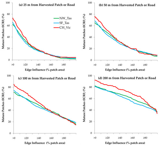 Inverse cumulative relative frequency (ICRF; %) of mature forest patches at different levels of edge influence for three study areas (Southern Forests Tasmania (SF); North West Tasmania (NW); Central Highlands Victoria (CH)). Edge influence is the proportion of a mature forest patch that is within a particular distance of harvested patches or roads: (a) 25 m; (b) 50 m; (c) 100 m; and (d) 200 m. For example: in (a), 11% of mature forest patches in Southern Forests Tasmania had more than 50% of their patch area within 25 m of a harvested patch or road.