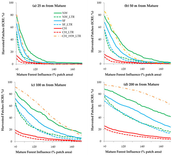 Inverse cumulative relative frequency (ICRF; %) of harvested patches at different levels of mature forest influence for three study areas (Southern Forests Tasmania (SF); North West Tasmania (NW); Central Highlands Victoria (CH)). Mature forest influence is the proportion of harvested patch area within a particular distance of structurally mature forest distance: (a) 25 m; (b) 50 m; (c) 100 m; and (d) 200 m. ICRF curves were calculated for all mature forest patches (no suffix) and mature forest patches in long-term retention (_LTR). In Victoria, relationships were also generated for 1939 regrowth in long-term retention (CH_1939_LTR). For example: in (a), 19% of harvested patches in Southern Forests Tasmania had more than 10% of their patch area within 25 m of a mature forest patch.