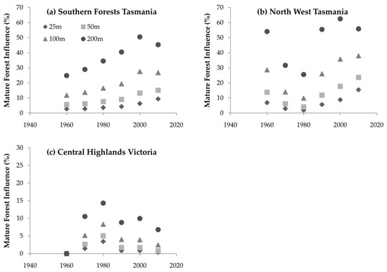 Average proportion of harvested patch area within 25 m, 50 m, 100 m, and 200 m of structurally mature forest (i.e., mature forest influence) over time for (a) Southern Forests Tasmania; (b) North West Tasmania; and (c) Central Highlands Victoria.
