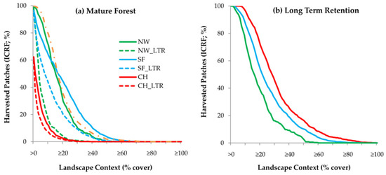 Inverse cumulative relative frequency (ICRF; %) of harvested patches at different levels of surrounding mature forest cover (i.e., landscape context) for three study areas (Southern Forests Tasmania (SF); North West Tasmania (NW); Central Highlands Victoria (CH)). Landscape context is the percentage cover of (a) structurally mature forest or (b) long-term retention (of any age) within a 1000 m buffer around the perimeter of a harvested patch. In (a) ICRF curves were calculated for (i) structurally mature forest patches (no suffix) and (ii) structurally mature forest patches in long-term retention (_LTR). In Victoria, ICRF curves were also generated for 1939 regrowth in long-term retention (CH_1939_LTR). For example: in (a), 44% of mature forest patches in Southern Forests Tasmania had more than 20% mature forest cover in the surrounding 1000 m buffer.