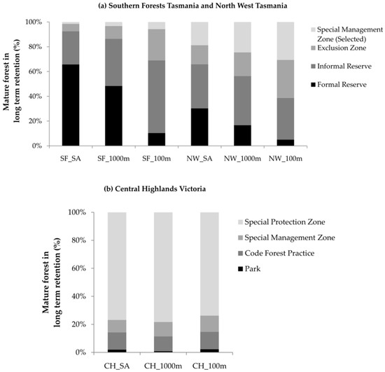 The proportion of structurally mature forest in long-term retention (Southern Forests Tasmania (SF) = 64%; North West Tasmania (NW) = 35%; Central Highlands Victoria (CH) = 60%) was higher than long-term retention when all forest types were considered (SF = 34%; NW = 20%; CH = 37%). In the Tasmanian study areas, formal reserves such as National Parks contributed progressively less to the provision of long-term retention of mature forests around regenerating patches with decreasing spatial scale (Figure 7). Long-term retention of mature forests in Central Highlands Victoria was comparatively insensitive to spatial scale (Figure 7). Informal reserves, special protection/management zones, and exclusion zones were the primary form of long-term retention at local scales (100 m) in all three study areas (Figure 7).