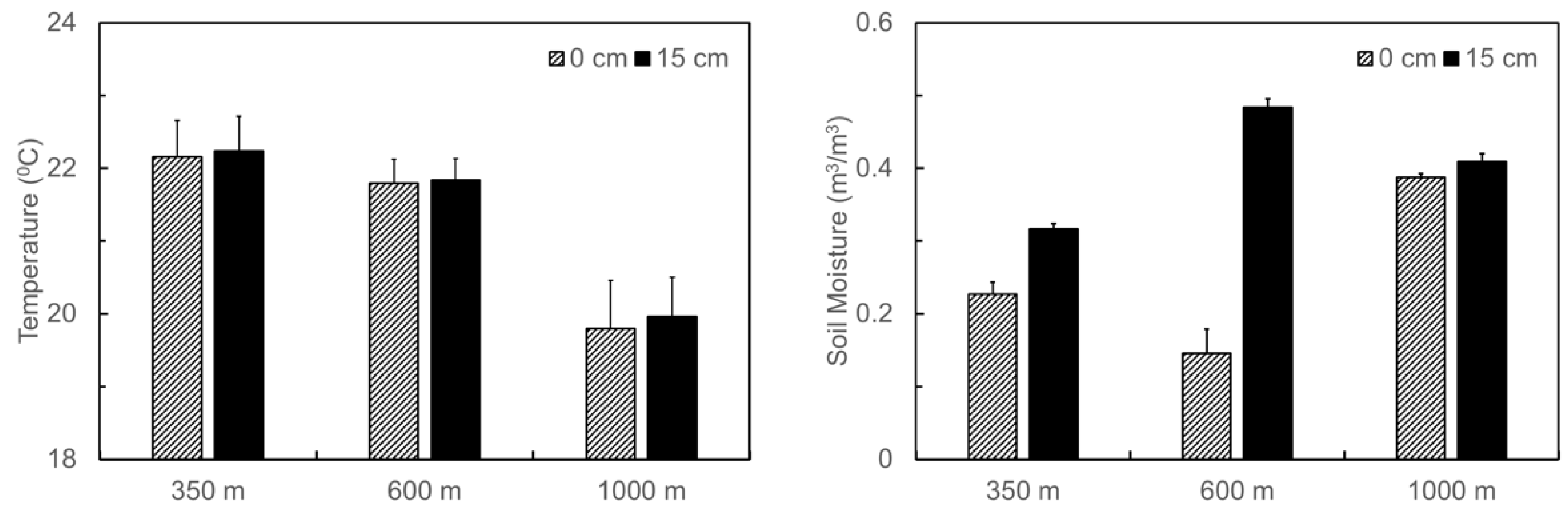 Soil temperature and moisture at the three translocation sites, on average, followed the naturally occurring gradients in climate along the elevation gradient, i.e., decreased temperature but increased moisture from the foothill to the top (Figure 2). The averaged soil temperature within the depth of 0–15 cm during the period July 2011–March 2012 decreased from 22.2 °C at 350 m, to 21.8 °C at 600 m, and to 19.9 °C at 1000 m. On the other hand, the averaged soil moisture increased from 0.27 m3·m−3 at 350 m, to 0.31 m3·m−3 at 600 m, and to 0.4 m3·m−3 at 1000 m. The difference in soil moisture between the surface and the depth of 15 cm was larger at the site of 600 m than at the other two sites.