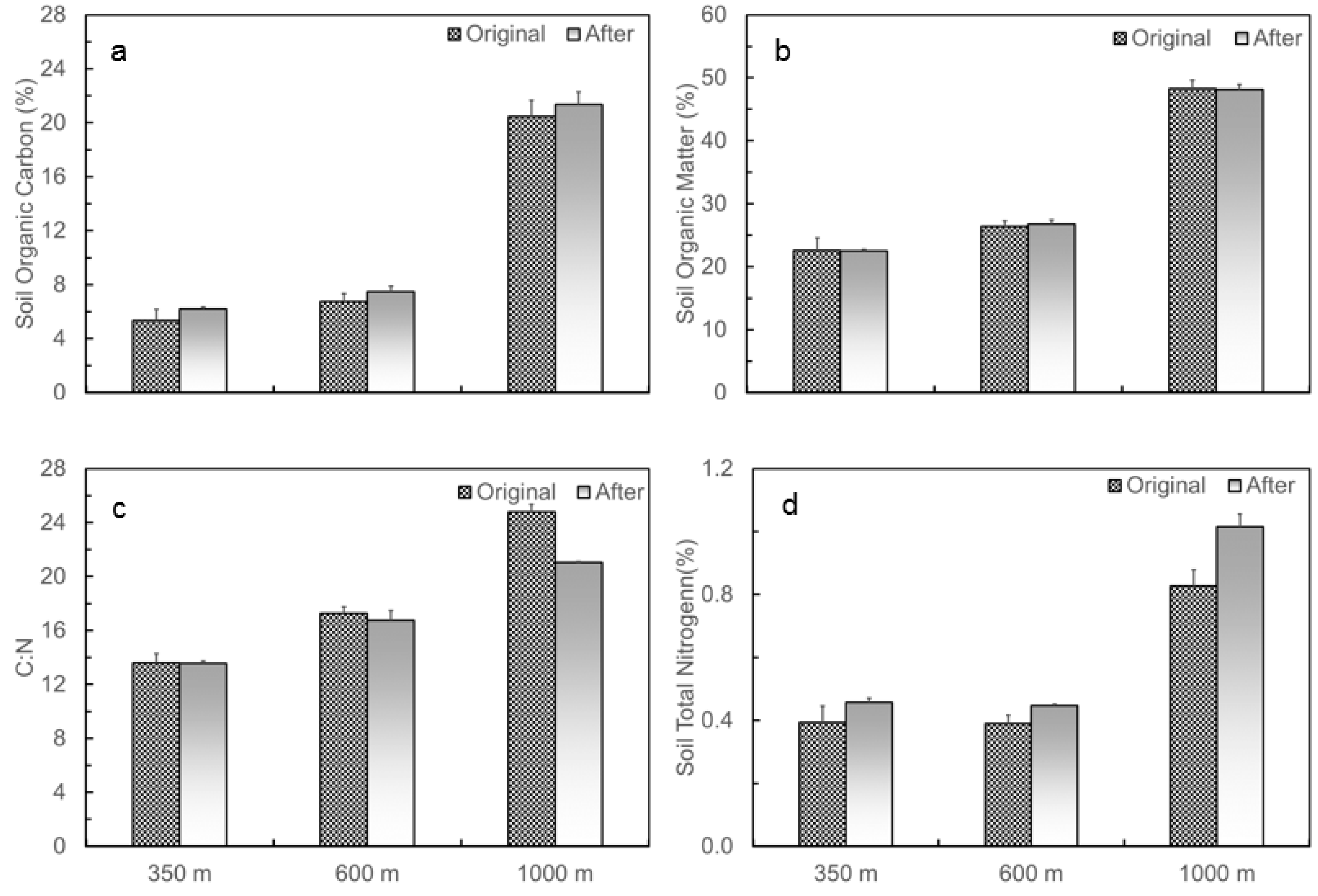 Initial patterns of SOC, SOM, and C:N all showed increased trends along the elevation gradient from low to top (Figure 3a–c). SOC increased from 5.4% at 350 m to 6.8% at 600 m, and to 20.5% at 1000 m, and SOM increased from 22.5% to 26.4% and to 48.2%, respectively. C:N increased from 13.6, to 17.2, and to 24.8 at the sites of 350, 600, and 1000 m, respectively. Soil total nitrogen was higher at 1000 m than at 350 or 600 m (Figure 3d). When measured 11 months after translocation, SOC increased to 6.2%, 7.5%, and 21.3% for the soils originating from 350, 600, and 1000 m, respectively. SOC originating from 350 m changed to 6.4% and 5.9% when translocated to 350 and 1000 m, respectively. For soils originating from 1000 m, SOC changed to 20.6% and 23.2% when translocated to 350 and 1000 m, respectively. Soil total nitrogen also increased after the soil translocation experiment. For the soils with the same source but translocated to different elevations, changes in soil total nitrogen follow the pattern of changes in SOC.