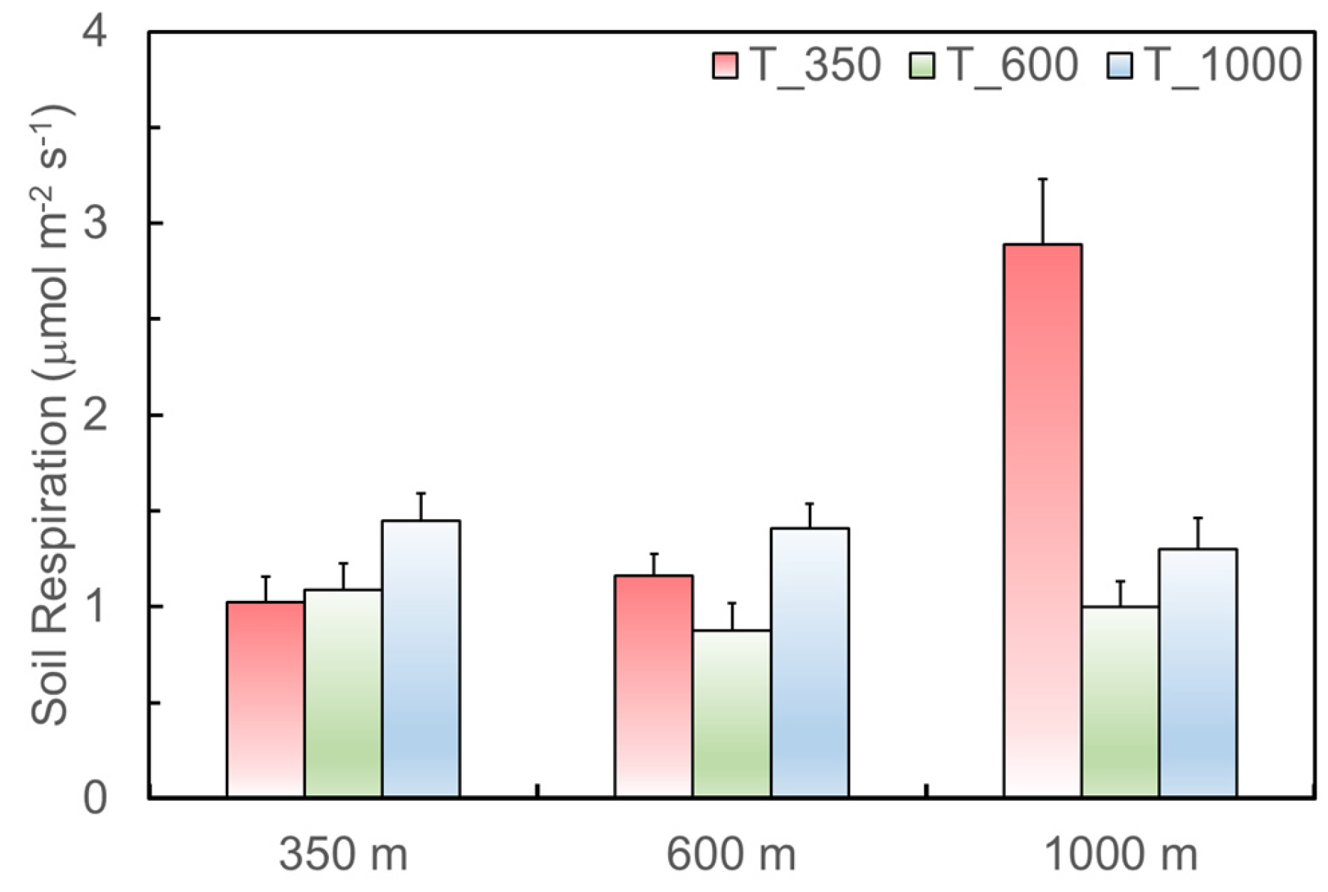 An ANOVA test on the log-transformed Rs among the three translocated sites indicated that the treatment of the translocation site had significant effects on soil respiration (F(2,71) = 6.07, p = 0.004). Soils translocated to the site at 350 m had a higher respiration rate than those translocated to 600 or 1000 m.