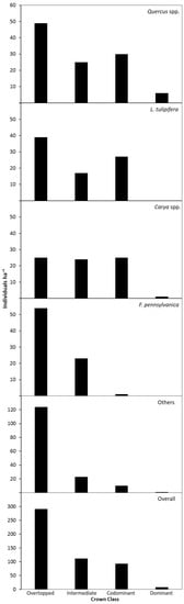 Crown class distributions of trees (≥5 cm dbh) by group in a multi-cohort forest on the Oakmulgee Ranger District of the Talladega National Forest, Alabama. Crown classes are based on the amount and direction of intercepted light [22]. See Table 1 for a list of species included in the others group.