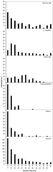 The diameter structure of all trees showed an inverse J-shape from small to large size classes (Figure 3). The mean q-factor was 1.34 ± 0.1 (SE) with a maximum of 1.88 between the 15–20 cm and 20–25 cm size classes and a minimum of 0.63 between the 55–60 cm and 60–65 cm size classes. The quadratic mean diameter (QMD) of the stand was 26 cm. Quercus species were documented in all size classes and exhibited decreased abundance with increased size class in most cases, approximating the stand’s inverse J-shape distribution. Liriodendron tulipifera showed a uniform diameter distribution with apices in the 10–15 cm and 15–20 cm size classes. Liriodendron tulipifera represented the two largest diameter trees with diameters of 84.5 cm and 82.7 cm. Carya exhibited a mostly uniform distribution, peaking in the 30–35 cm diameter class. Fraxinus pennsylvanica was the most abundant species less than 25 cm dbh (n = 77); only one individual was greater than 25 cm dbh.