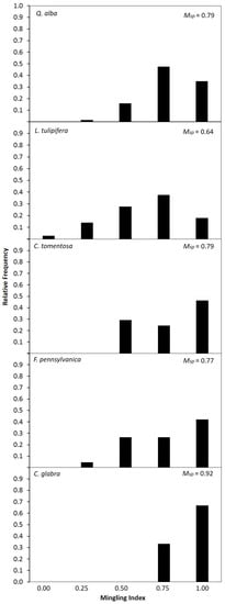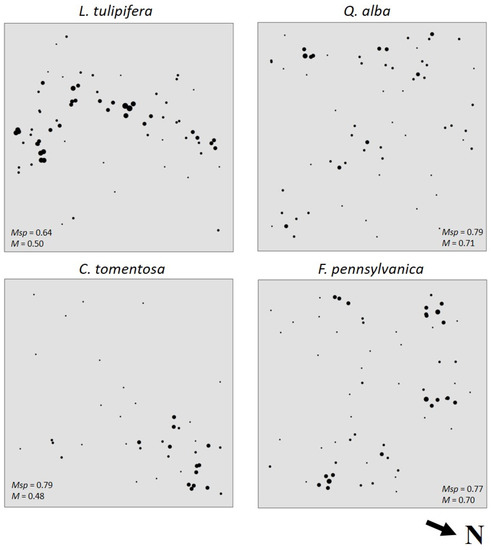 When a species is interspersed randomly within a stand, the value of 1 − Msp approaches Psp for the given species [49]. Thus, a value of M approaching 1 indicates a random spatial distribution for the species, and a value approaching 0 indicates spatial clustering.