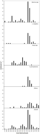 Inner pith dates at breast height were recorded for 235 trees (Figure 6). We documented two trees dating prior to 1800, a Q. alba and a Q. stellata with inner dates of 1774 and 1776, respectively. We documented 42 trees representing seven species with inner dates prior to 1900: Q. alba (n = 16), C. glabra (n = 10), C. tomentosa (n = 6), L. tulipifera (n = 3), Nyssa sylvatica (n = 3), Q. stellata (n = 3), and Quercus rubra (n = 1). Quercus establishment was continuous from the 1840s to the 1980s, with at least one individual establishing in every decade except the 1930s. Quercus establishment spiked in the 1940s and 1950s with 59% of dated individuals establishing in these decades. Four L. tulipifera individuals established prior to the 1940s with 72% of individuals establishing in the 1940s and 1950s. Carya establishment was continuous from the 1850s to the 1930s, and spiked in the 1910s. Only one Carya individual established after the 1930s. Fraxinus pennsylvanica establishment spiked in the 1940s with only two individuals exhibiting inner dates prior to this decade. The age structure for all trees showed a tri-modal distribution with a major peak in the 1940s representing the establishment of 27% of all dated stems. Smaller peaks were apparent in the 1850s and 1910s representing 6% and 7% of dated stems, respectively.