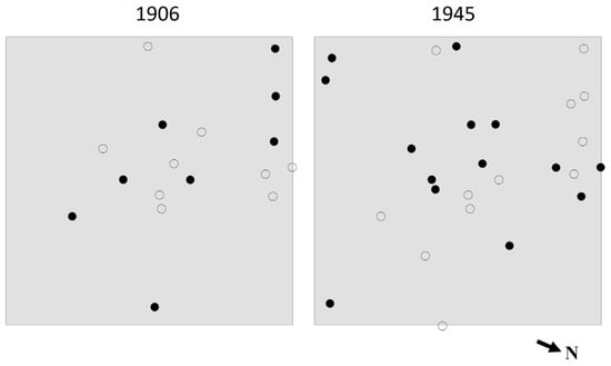 Stem maps of a 1 ha plot showing the position of present day canopy Quercus trees that were at least 10 years of age in 1906 and 1945, respectively. Solid dots indicate stems experiencing release in the respective year, open dots indicate stems not experiencing release in the respective year.