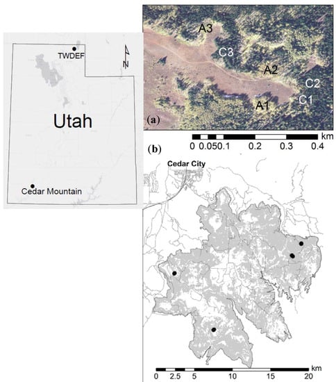 The sampling for this study was conducted at the T.W. Daniels Experimental Forest (TWDEF) located approximately 30 km northeast of Logan in northern Utah, and at CM in SW-Utah (Figure 1, Table 1).