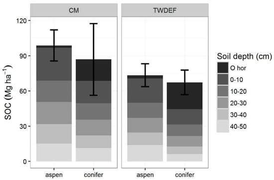 Total SOC stocks (O-horizon + mineral soil up to 50 cm) under aspen were slightly higher than SOC stocks under conifers: 93.7 ± 16.11 Mg·ha−1 under aspen vs. 82.9 ± 27.9 Mg·ha−1 under conifers (p = 0.51, t = 0.72; ES = 0.32, CI = (1.15, 1.79), SN > 78). Mineral SOC stocks were consistently higher under aspen (Figure 2) at each site, and were on average 91.55 ± 16.3 Mg·ha−1 under aspen vs. 61.25 ± 22.4 Mg·ha−1 under conifer stands (p = 0.08, t = 2.31; ES = 1.03, CI = (0.52, 2.58), SN > 9). (The difference between plots sampled at CM and TWDEF ranged from 7.4 to 81. 5 Mg·ha−1, and was on average 30.3 Mg·ha−1.