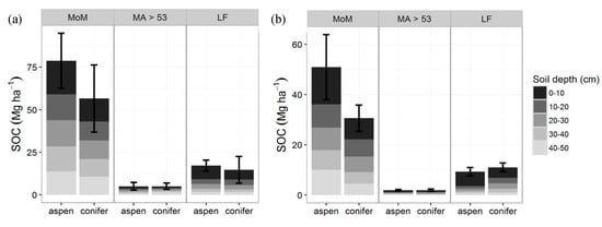 At all sites, SOC consisted mainly of the more stable MoM fraction (68%–87%) (Figure 3). At TWDEF, aspen had a slightly higher SOC proportion in the MoM fraction (72% of mineral SOC) compared to conifers (68%), while conifers had more C in the LF fraction (23%) compared to aspen (11%). At CM, vegetation differences in SOC distribution among the different fractions were less pronounced with the LF fraction, constituting 16% of SOC pools under aspen and 19% under conifers. At TWDEF, MoM stocks (0–50 cm) were 50.9 ± 12.9 Mg C·ha−1 under aspen vs. 30.6 ± 5.3 Mg C·ha−1 under conifers; with corresponding values at CM of 78.8 ± 16.2 Mg C·ha−1 under aspen and 56.6 ± 19.7 Mg C·ha−1 under conifers (p = 0.15, t = 1.8; ES = 0.78, CI = (0.73, 2.29), SN > 15). At TWDEF, slightly higher LF C pools were found under conifer stands (11.0 ± 1.7 Mg C·ha−1) than aspen (9.3 ± 1.7 Mg C·ha−1), but at CM the opposite pattern was observed with aspen having higher LF C pools (17.2 ± 3.2 Mg C·ha−1) than conifers (14.7 ± 7.9 Mg C·ha−1), mostly in the topsoil (p = 0.53, t = 0.69, SE = 0.31, CI = (1.16, 1.78), SN > 83). The MA fraction constituted less than 10% of SOC stocks under both overstories, and ranged from 2 to 5 Mg C·ha−1 at the northern and southern sites (p = 1, t = 0.005, SE = 0.002, CI = (1.46, 1.46), SN > 10,000).