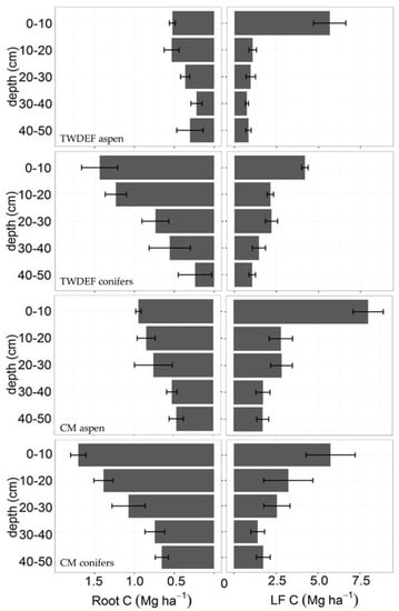 Root biomass and LF—light fraction C content (Mg·ha−1) by depth and vegetation type at TWDEF and CM. Error bars are standard errors of three plots at TWDEF and four sites at CM. For the whole soil profile, total root biomass was higher under conifers than aspen (p = 0.005, SE = 2.52), while light fraction pools were similar (p = 0.53, SE = 0.31).