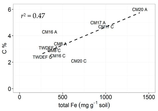 Relationship between total extractable Fe (mg·g−1 soil) and C concentrations in 0–10 cm depth soils from CM and TWDEF. The labels in the graph correspond to the plot labels in Table 1. “A” indicates aspen plots, and “C” indicates conifer plots.