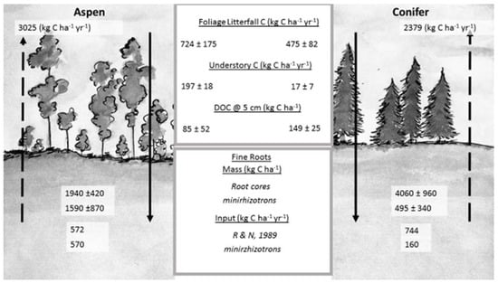 The aspen litterfall measured in this study was similar to what has been reported by Bartos and Debyle [60] in northern Utah—1397 kg·ha−1 of leaves, which corresponds to about 630 kg C·ha−1. The results are also similar to what has been found in Canada by Gower et al. [61]—1672 kg organic matter·ha−1 (752 kg C) in their northern study site and 2170 kg organic matter·ha−1 (977 kg C) in the southern study site. Conifer litterfall reported by Gower et al. [61] was smaller to what we found in our study—860 kg organic matter·ha−1 under pine (387 kg C) and 785 kg organic matter·ha−1 (353 kg C) under spruce in the southern site, as well as 619 kg organic matter·ha−1 under pine (279 kg C) and 684 kg organic matter·ha−1 under spruce (309 kg C) in the northern site. The differences in litterfall are probably due to differences in growing conditions between the boreal forests of Canada, and the semi-arid mountain forests of Utah.