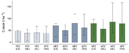 C stocks (t·ha−1) in the mineral soil of the surface layer (0–20 cm) for each flood zone (interval of 0–10 years and 20–100 years) and no-flood zone (NFZ). Letters in parentheses represent different textural matrices (SiL: Silt loam; SL: Sandy loam; LS: Loamy sand; Tot: Total soil samples). (This figure includes all the sites).