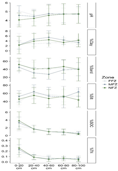 Graph of soil profiles (0–100 cm deep) with concentrations of SOC (%), TN (%), Clay (%), Sand (%), Silt (%), and pH values for the three study areas (FFZ, MFZ, and NFZ).