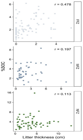 Relationships between the SOC (%) in surface soils (0–20 cm deep) and litter thickness (cm) using Spearman’s correlation, including the three zones (FFZ, MFZ, and NFZ). All the data were examined at a significance level of p = 0.05 (95%).