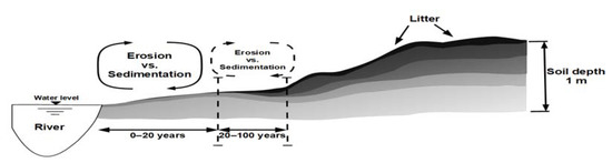 - Rieger, I.; Lang, F.; Kowarika, I.; Cierjacks, A. The interplay of sedimentation and carbon accretion in riparian forests. Geomorphology 2014, 214, 157–167. [Google Scholar] [CrossRef]