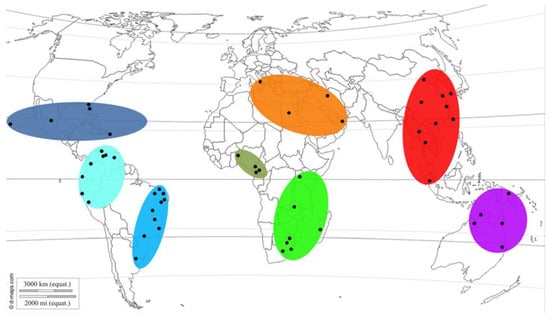 Countries considered in the analyses were grouped into eight geographic regions, including north America (Hawaii, Mexico, Puerto Rico, United States of America—USA), western south America (Colombia, Ecuador, Peru, Venezuela), eastern south America (Brazil, Uruguay), western Africa (Benin, Cameroon), southern and eastern Africa (Madagascar, South Africa, Uganda, Zambia), Middle East and Europe (Egypt, Iran, Italy, Oman), Asia (China, Indonesia, Korea, Thailand), and Australasia (Australia, Papua New Guinea) (Table 1 and Table 2).