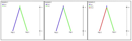 - Cornuet, J.M.; Pudlo, P.; Veyssier, J.; Dehne-Garcia, A.; Gautier, M.; Leblois, R.; Marin, J.M.; Estoup, A. DIYABC v2.0: A software to make approximate Bayesian computation inferences about population history using single nucleotide polymorphism, DNA sequence and microsatellite data. Bioinformatics 2014, 30, 1187–1189. [Google Scholar] [CrossRef] [PubMed]