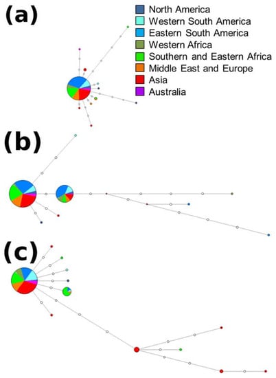 Haplotype networks generated for the (a) internal transcribed spacer rDNA (ITS), (b) translation elongation factor 1α (tef1α), and (c) β-tubulin-2 (tub2) loci. Only one haplotype resulted from analysis of the RNA polymerase II (rpb2) locus and is not included. Colours represent the different regions isolates were obtained from.