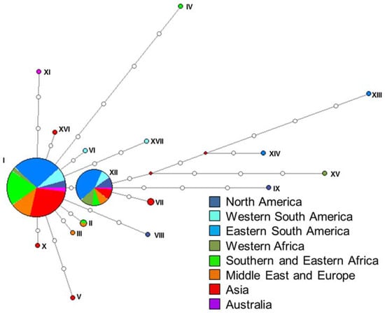 Haplotype network generated for the combined ITS and tef1α dataset. Colours represent the different regions isolates were obtained from. Haplotypes designated by Roman numerals (I–XVII). Open circles represent inferred haplotypes.