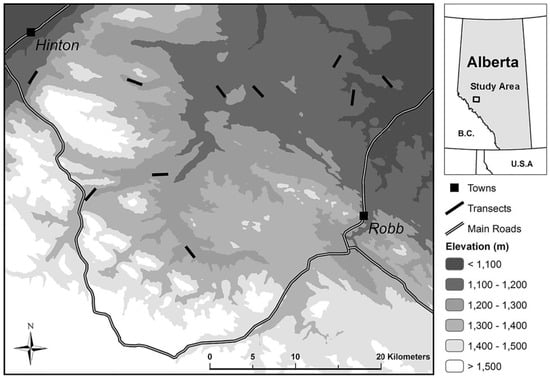 The study area covers 2389 km2 of managed, conifer-dominated forest southeast of the town of Hinton (53°24′41″ N, 117°33′50″ W) and north of the town of Robb (53°13′59″ N, 116°58′42″ W) in the Rocky Mountain foothills of west-central Alberta (Figure 1). The climate is moist and cool [68], with higher elevation in the west that declines in the east across a range from 950 m to 2500 m. Land cover types include evergreen, deciduous, and mixed forest consisting of dominant tree species such as lodgepole pine (Pinus contorta Douglas ex Loudon), white spruce (Picea glauca (Moench) Voss), and trembling aspen (Populus tremuloides Michx.) [68,69]. Open bogs, meadows, and previously harvested cutblocks are also present on the landscape. Active resource extraction and development by the forestry, mining, and energy (oil and gas) industries has resulted in varying degrees of anthropogenic disturbance.