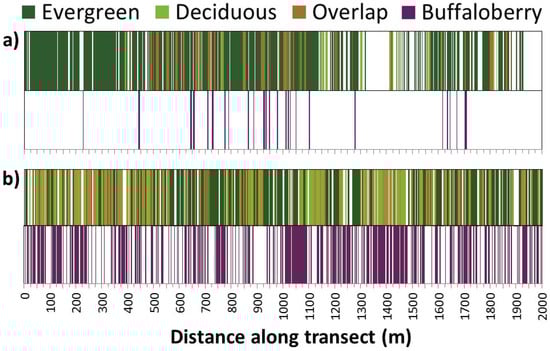 Example of raw forest canopy (upper bar) and buffaloberry shrub (lower bar) line-intercept transect data for two 2-km replicates (n = 10) representative of (a) average patch size and distribution; and (b) maximum cover of canopy and buffaloberry recorded during field sampling near Hinton, Alberta. The overlap refers to the presence of both evergreen and deciduous canopy within a given segment along a transect.