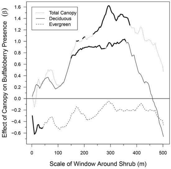 The total forest canopy had a positive effect on shrub presence across most spatial scales, and in particular, demonstrated significant (α = 0.05) effects from 170–178 m, 194–202 m, and 234–374 m (Figure 4). There was, however, a local negative peak at the 10-m scale and the weakest effect was at the 18-m scale. The effect of the total canopy became positive at larger spatial scales of canopy with the strongest relationship at the 294-m window size. Evergreen canopy had a negative effect on the presence of buffaloberry shrubs across all spatial scales and was significant at local scales from 2 m to 42 m. The effect of the evergreen canopy was strongest at the 10-m scale, with two additional peaks of negative association at 106 m and 210 m, and was weakest at the 294-m scale. In contrast to evergreen canopy, deciduous canopy had a positive effect on the presence of buffaloberry shrubs up to the 462-m scale, which was significant for nearly all scales between 150 m and 358 m. The effect of deciduous canopy was weakest at the 2-m scale and strongest at 354 m, after which it decreased sharply and became negative at very large scales.