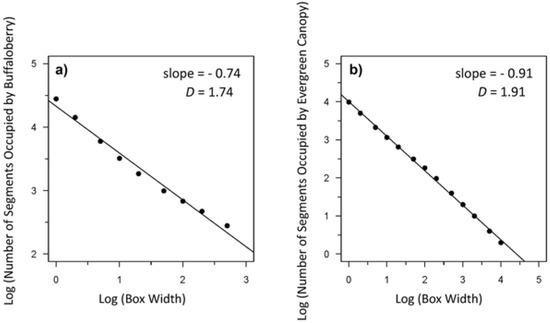 Example from Transect 1 of a log-log plot of the relationship between box width (scale) and the number of segments occupied by (a) buffaloberry (slope = −0.74); and (b) evergreen canopy (slope = −0.91) used to calculate the fractal dimension (D) of each. The slope of the regression line equals 1-D [47] for a given transect. The number of orders of magnitude across which the relationship is fractal-like can be determined based on the x-intercept.